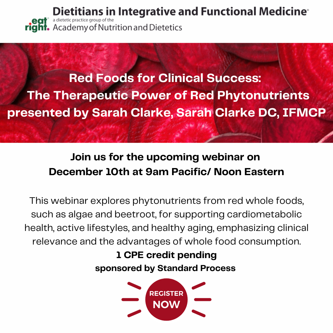 Red whole foods are rich in compounds with well-documented cardiovascular, metabolic, and overall health-span benefits. Unfortunately, most patients fall short of the ideal intake of these powerful and nutrient-dense foods. In this webinar, we will explore the supportive potential of bioactive red phytonutrients from astaxanthin-rich whole algae, red beetroot, and more while highlighting the power of consuming these compounds within a whole food matrix. We will discuss the clinical significance and patient application with an emphasis on cardiometabolic health, active lifestyle, and healthy aging.