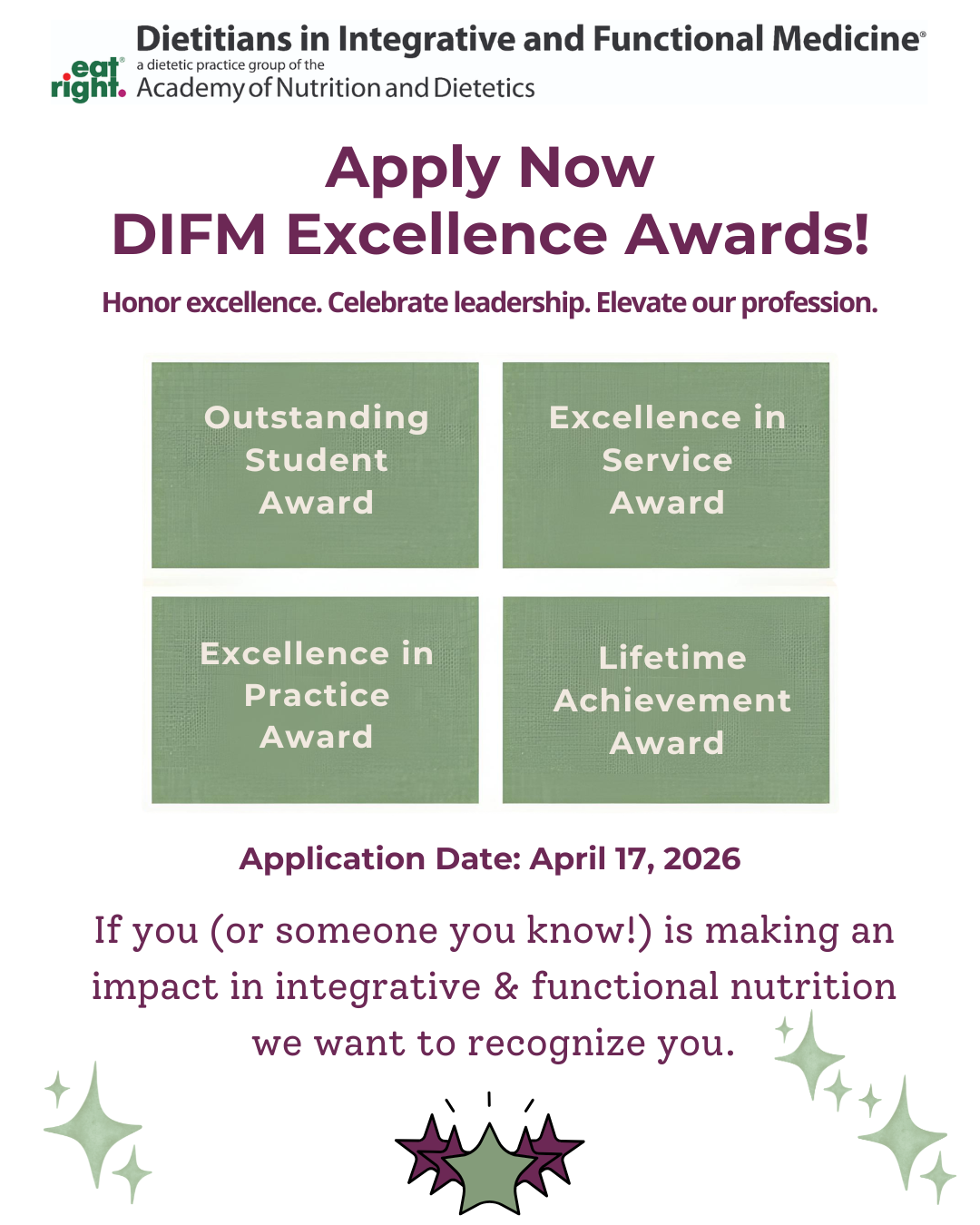 All active members in good standing with the Academy of Nutrition and Dietetics and DIFM DPG are eligible. Exempt members include the following: previous winners of the Excellence in Practice Award and any current DIFM Executive Committee member (or currently on ballot for DIFM elected office)