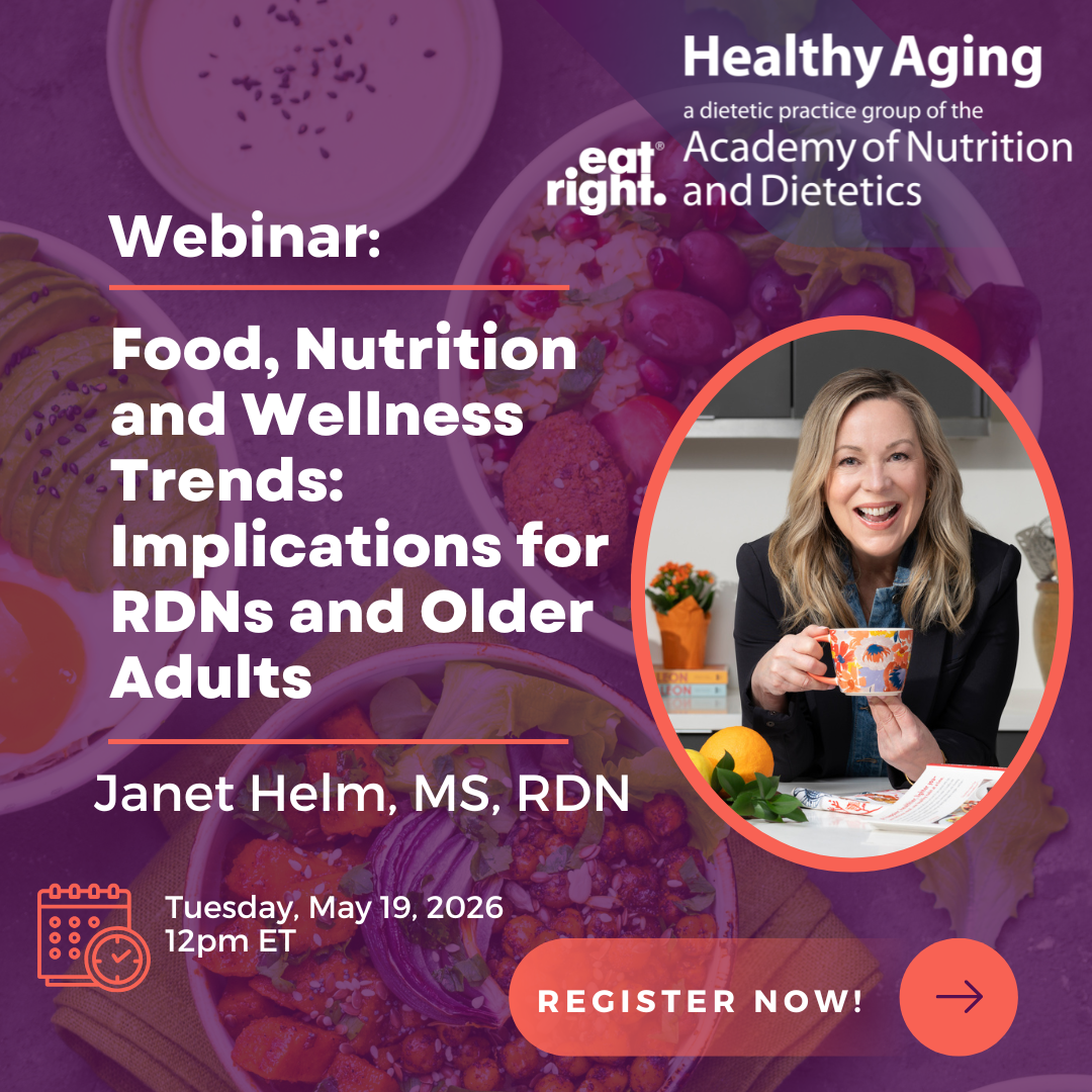 This session explores the most influential food, nutrition, and wellness trends, including food as medicine, functional and mood-supporting ingredients, personalized nutrition, cultural foodways, climate-conscious choices, and the growing demand for health-forward indulgence. Trends are translated into practice implications for food and nutrition professionals seeking insights, particularly for older adults.
