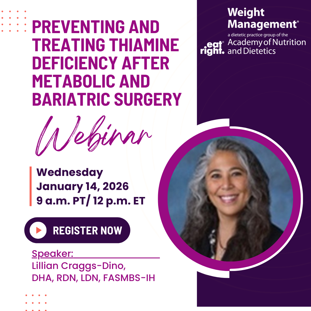 Vitamin B1 (thiamine) deficiency is implicated in Wernicke's encephalopathy, a serious neuro-psychiatric syndrome. After metabolic and bariatric surgery (MBS), patients are at risk for developing thiamine deficiency for many reasons, but unfortunately, it often goes underdiagnosed and unrecognized. The role of a registered dietitian is paramount for the identification of these risk factors, and they play a major role in the prevention and treatment of the deficiency before the progression to this disabling and potentially fatal deficiency disease. This webinar will provide insights from a member of the ASMBS Wernicke's Encephalopathy Task Force and review the current evidenced-based publication and clinical guideline that can be applied when performing nutrition assessment and implementing appropriate interventions.