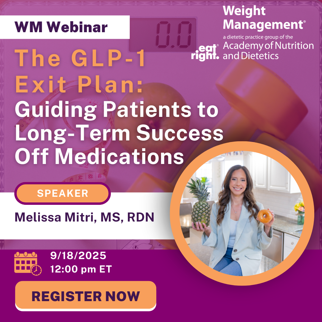 As more clients turn to GLP-1 medications for weight loss, RDNs are now faced with a critical role—helping them transition off these medications if needed, without regaining the weight or losing progress. This webinar dives into what a successful "GLP-1 exit plan" looks like from a nutrition and behavior perspective. Attendees will learn evidence-based strategies to support clients through the transition, including how to build sustainable eating patterns, preserve muscle mass, and maintain motivation long-term.